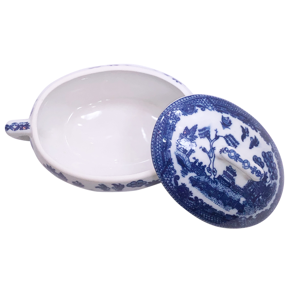 - Blue willow miniature size oval shaped tureen with double handles and a cover