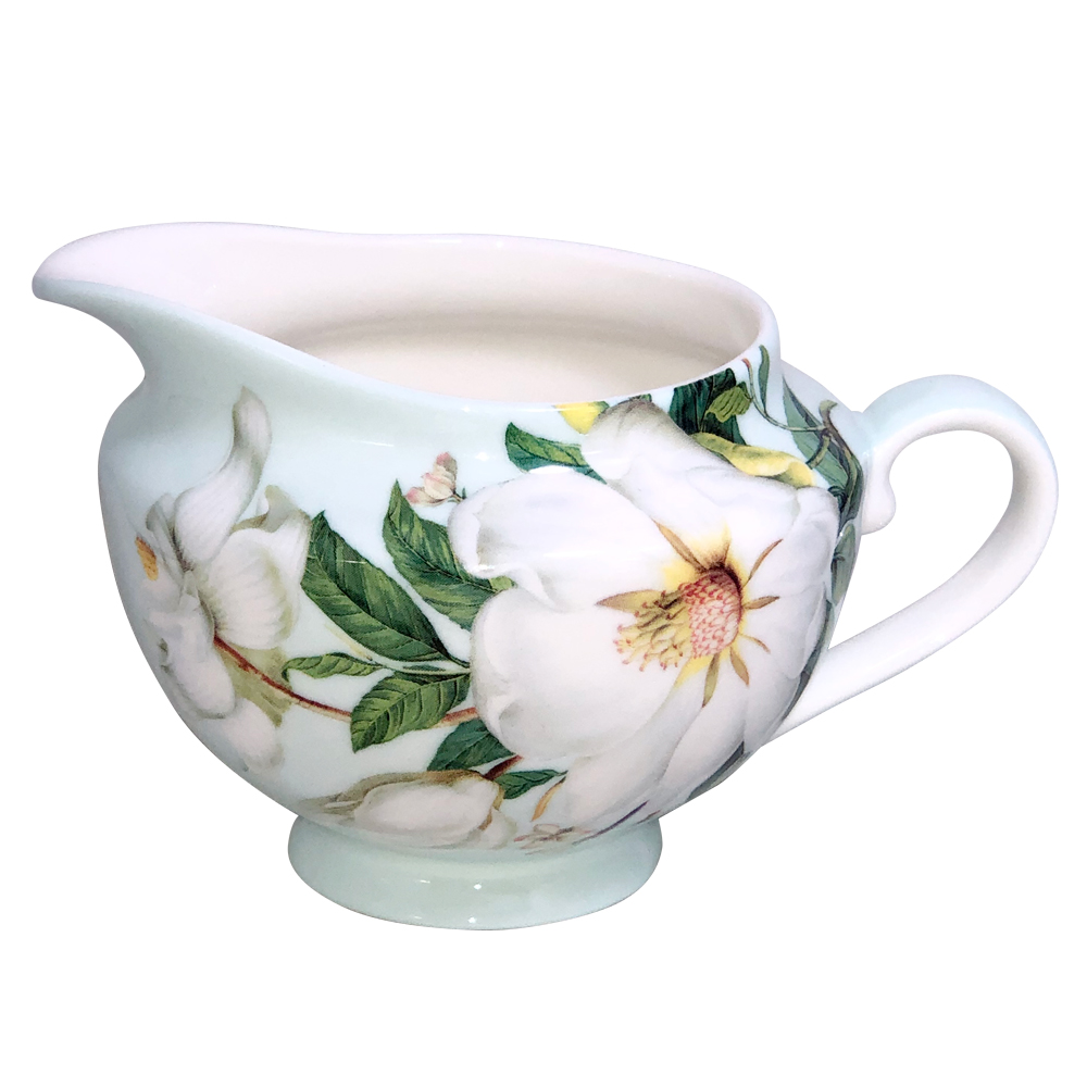 - A vintage style cream and sugar set, covered overall in a jade green celadon color and decorated with luxuriant blooming magnolia flowers