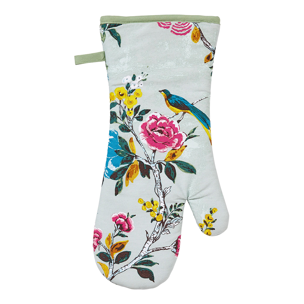 Oven mitt with the 19th-century orient eau de Nil colors, lightly washed and distressed Avairy collection adding a subtle depth and texture to the look. The pink and teal Peony roses accompany with birds throughout this print.